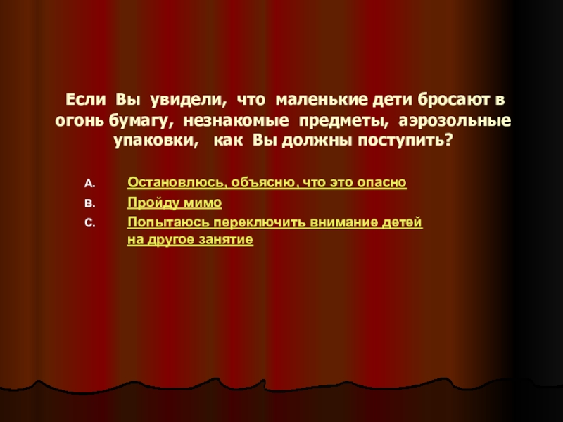 Если Вы увидели, что маленькие дети бросают в огонь бумагу, незнакомые предметы, аэрозольные упаковки, как Вы должны поступить?