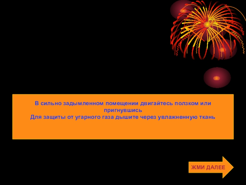 Молодец!ЖМИ ДАЛЕЕВ сильно задымленном помещении двигайтесь ползком или пригнувшисьДля защиты от угарного газа дышите через увлажненную ткань