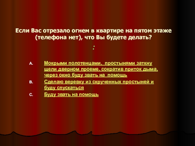 Мокрыми полотенцами, простынями заткну щели дверном проеме, сократив приток дыма, через окно буду звать на помощьСделаю веревку