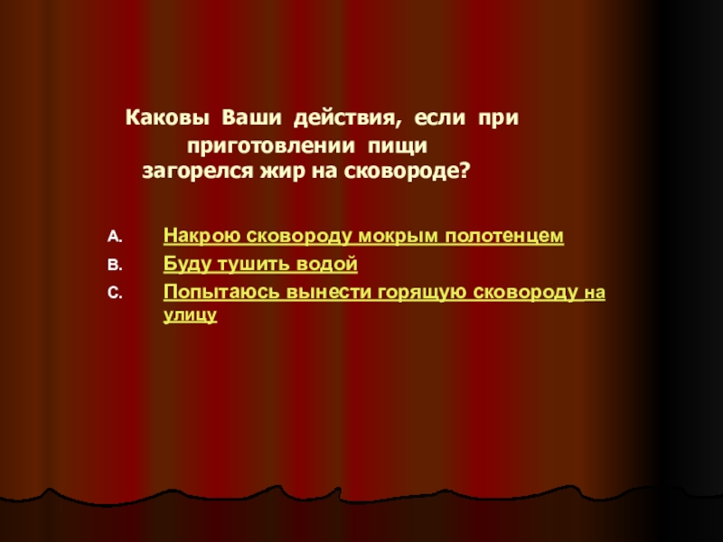 Буду тушить водой	Обесточу электросеть, затем приступлю к тушению  Буду звать на помощь	Что Вы предпримете, если загорелась