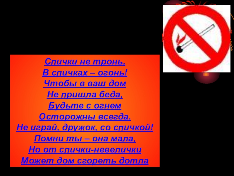 «ОСТОРОЖНО: ОГОНЬ!»Спички не тронь, В спичках – огонь! Чтобы в ваш дом Не пришла беда, Будьте с