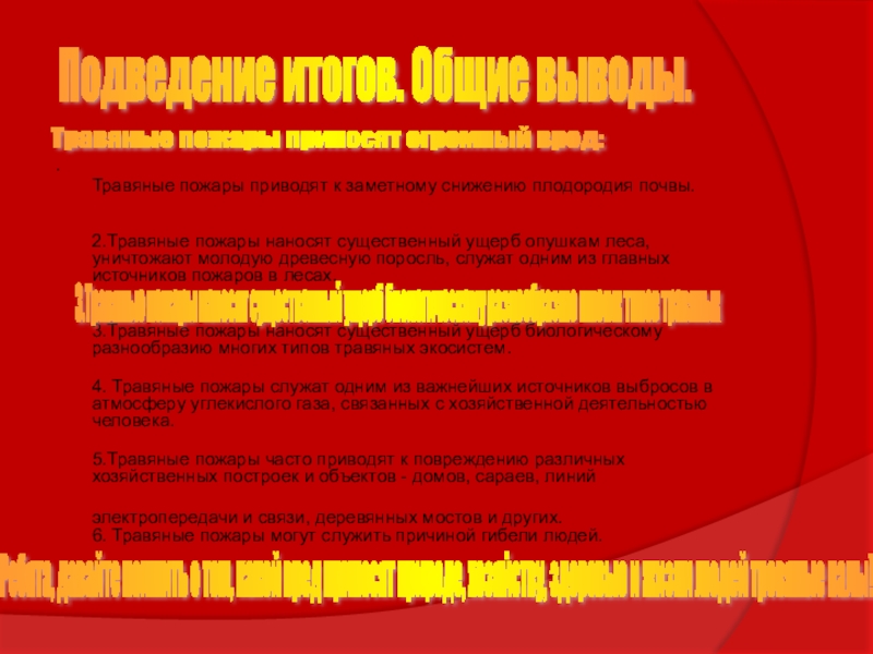 Ребята, давайте помнить о том, какой вред приносят природе, хозяйству, здоровью и жизни людей тровяные палы!