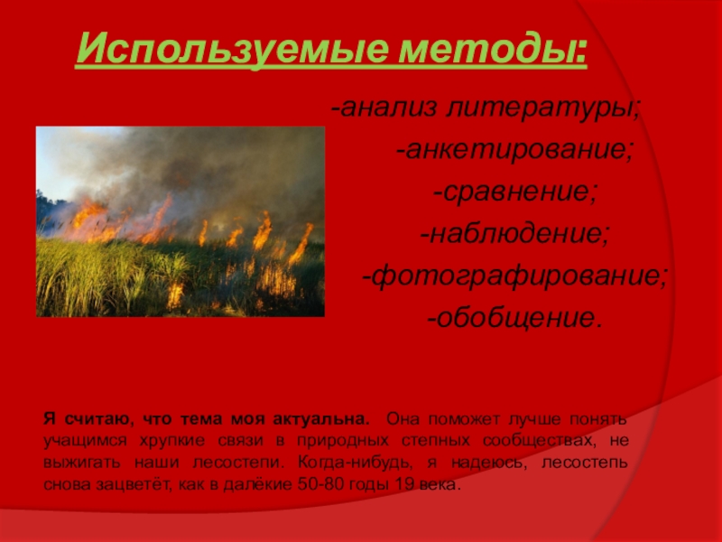 Я считаю, что тема моя актуальна. Она поможет лучше понять учащимся хрупкие связи в природных степных сообществах, не выжигать наши лесостепи. Когда-нибудь, я надеюсь, лесостепь снова зацветёт, как в далёкие 50-80 годы 19 века.