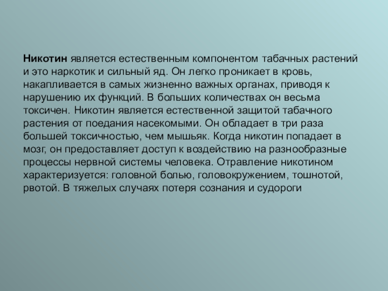 яд. Он легко проникает в кровь, накапливается в самых жизненно важных органах, приводя к нарушению их функций. В больших количествах он весьма токсичен. Никотин является естественной защитой табачного растения от поедания насекомыми. Он обладает в три раза большей токсичностью, чем мышьяк. Когда никотин попадает в мозг, он предоставляет доступ к воздействию на разнообразные процессы нервной системы человека. Отравление никотином характеризуется: головной болью, головокружением, тошнотой, рвотой. В тяжелых случаях потеря сознания и судороги