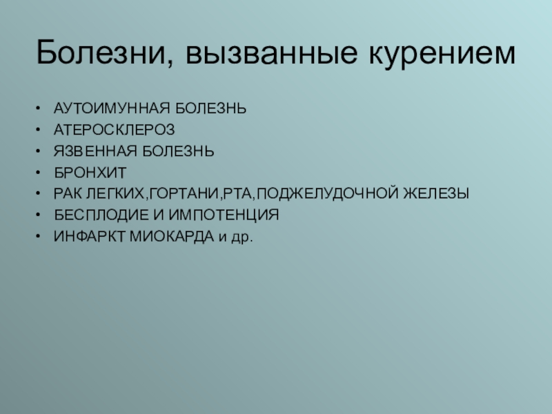 Болезни, вызванные курениемАУТОИМУННАЯ БОЛЕЗНЬАТЕРОСКЛЕРОЗЯЗВЕННАЯ БОЛЕЗНЬБРОНХИТ РАК ЛЕГКИХ,ГОРТАНИ,РТА,ПОДЖЕЛУДОЧНОЙ ЖЕЛЕЗЫБЕСПЛОДИЕ И ИМПОТЕНЦИЯИНФАРКТ МИОКАРДА и др.