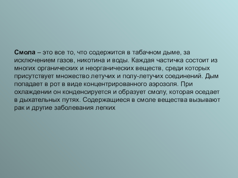 Слайд 6Смола – это все то, что содержится в табачном дыме, за
