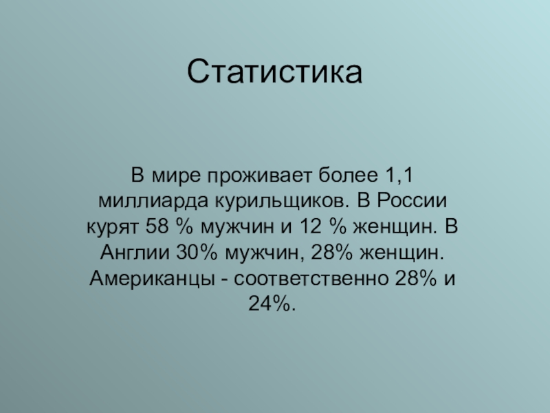 Статистика В мире проживает более 1,1 миллиарда курильщиков. В России курят 58 % мужчин и 12 % женщин. В Англии 30% мужчин, 28% женщин. Американцы - соответственно 28% и 24%.