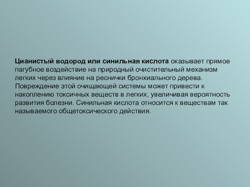 очистительный механизм легких через влияние на реснички бронхиального дерева. Повреждение этой очищающей системы может привести к накоплению токсичных веществ в легких, увеличивая вероятность развития болезни. Синильная кислота относится к веществам так называемого общетоксического действия.