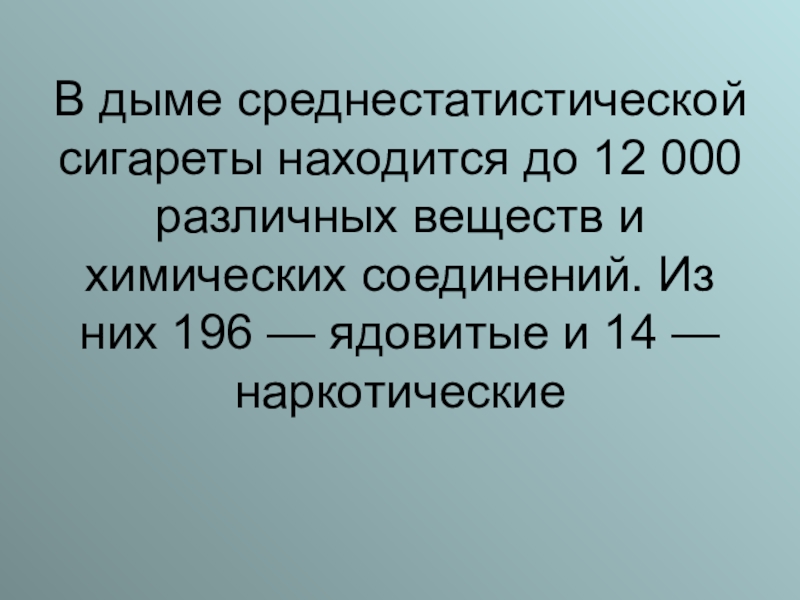 Слайд 4В дыме среднестатистической сигареты находится до 12 000 различных веществ и