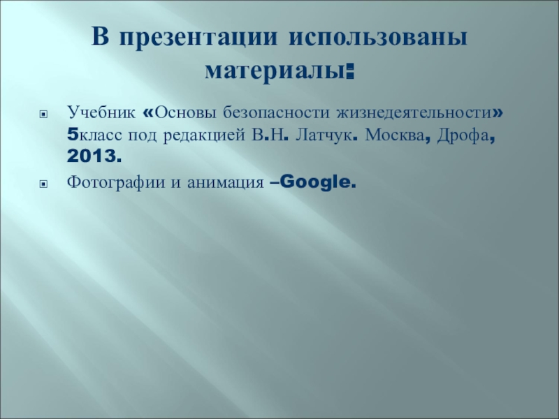 В презентации использованы материалы:Учебник «Основы безопасности жизнедеятельности» 5класс под редакцией В.Н. Латчук. Москва, Дрофа, 2013.Фотографии и анимация