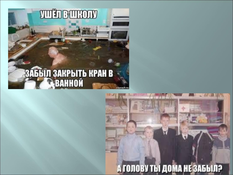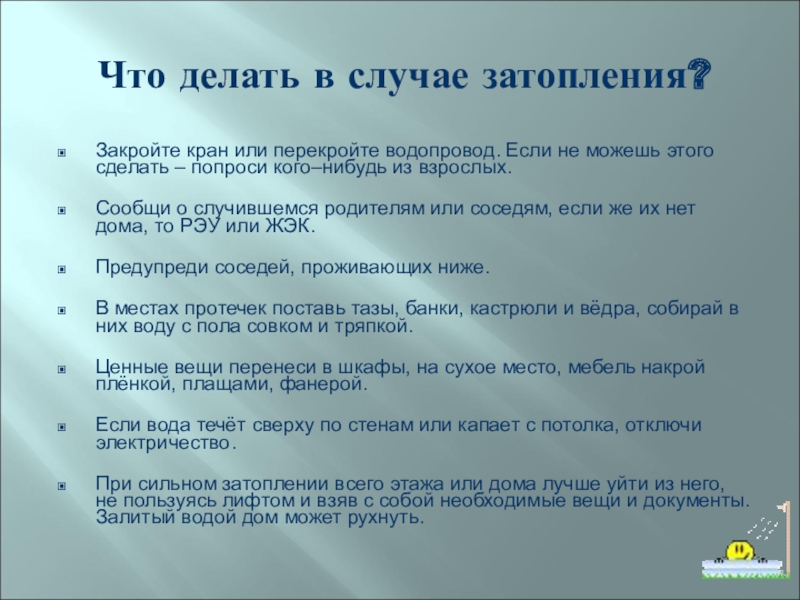 Что делать в случае затопления?Закройте кран или перекройте водопровод. Если не можешь этого сделать – попроси кого–нибудь