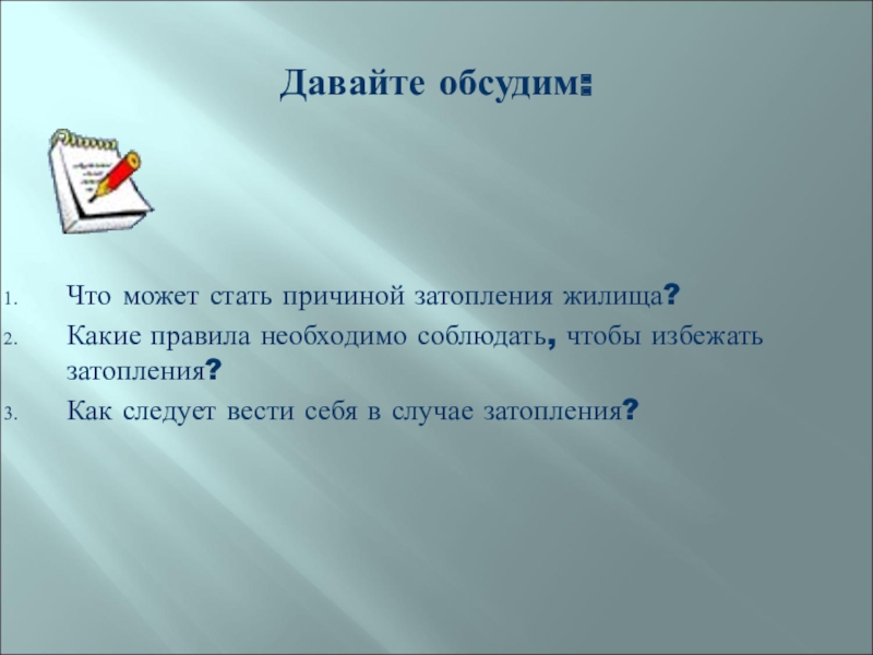 Давайте обсудим:Что может стать причиной затопления жилища?Какие правила необходимо соблюдать, чтобы избежать затопления?Как следует вести себя в