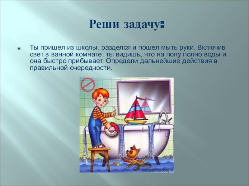 Включив свет в ванной комнате, ты видишь, что на полу полно воды и она быстро прибывает. Определи дальнейшие действия в правильной очередности.