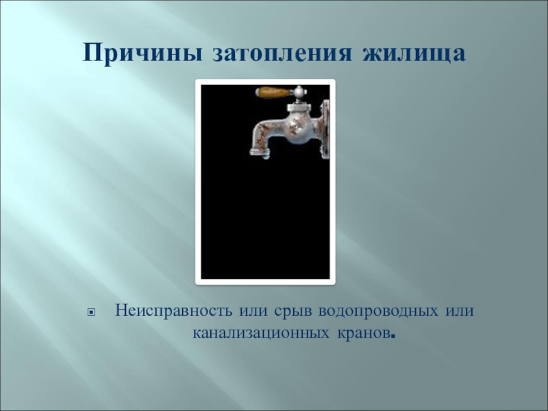 Причины затопления жилищаНеисправность или срыв водопроводных или канализационных кранов.