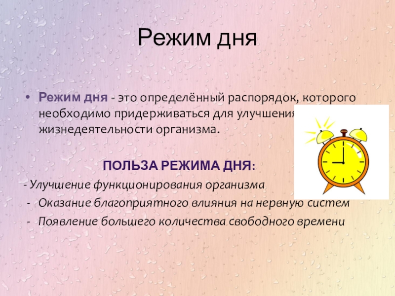 Режим дня - это определённый распорядок, которого необходимо придерживаться для улучшения