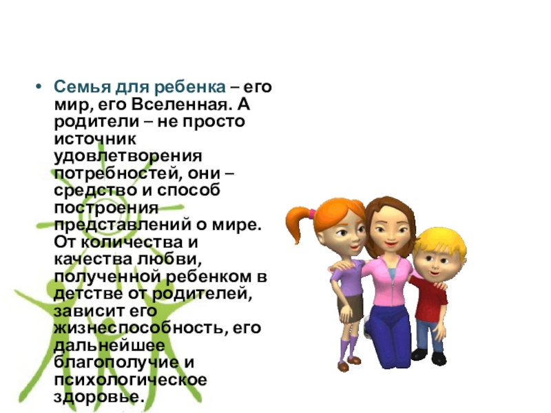 Слайд 11Семья для ребенка – его мир, его Вселенная. А родители –