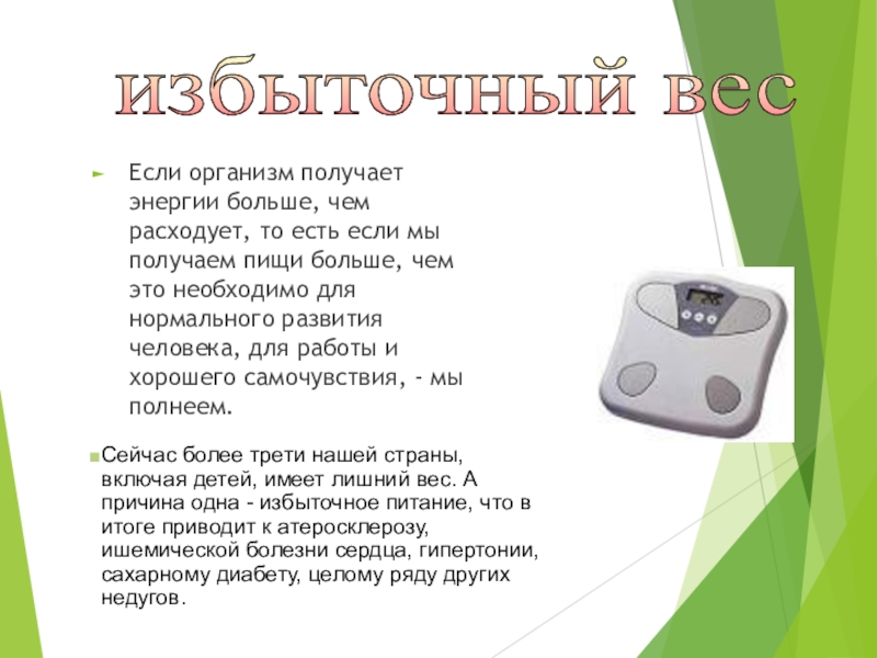 Сейчас более трети нашей страны, включая детей, имеет лишний вес. А причина одна - избыточное питание, что в итоге приводит к атеросклерозу, ишемической болезни сердца, гипертонии, сахарному диабету, целому ряду других недугов.