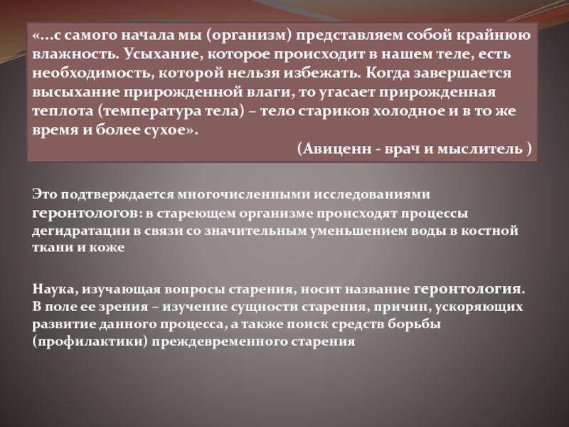 Это подтверждается многочисленными исследованиями геронтологов: в стареющем организме происходят процессы дегидратации в связи со значительным уменьшением воды в костной ткани и коже