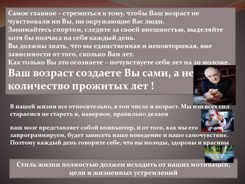 наш мозг представляет собой компьютер, и от того, как мы его запрограммируем, будет зависеть наше поведение и наше самочувствие. Поэтому каждый день говорите себе, что вы молоды, здоровы и красивы