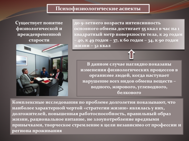 Комплексные исследования по проблеме долголетия показывают, что наиболее характерной чертой «стратегии жизни» являлась у них, долгожителей, повышенная работоспособность, правильный образ жизни, рациональное питание, не злоупотребление вредными привычками, творческое стремление к цели независимо от профессии и региона проживания