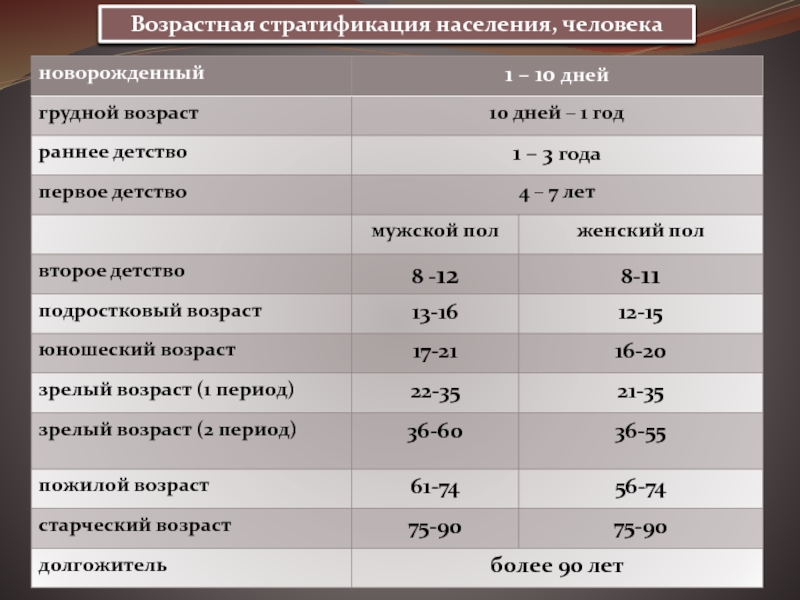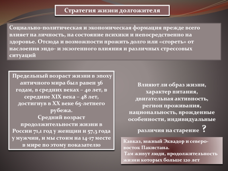 Предельный возраст жизни в эпоху античного мира был равен 36 годам, в средних веках – 40 лет, в середине XIX века – 48 лет, достигнув в XX веке 65-летнего рубежа.