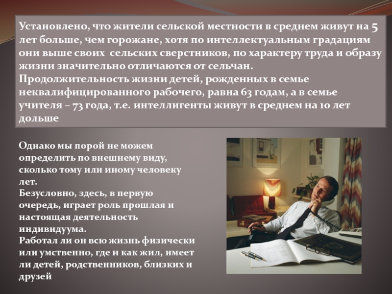 Работал ли он всю жизнь физически или умственно, где и как жил, имеет ли детей, родственников, близких и друзей