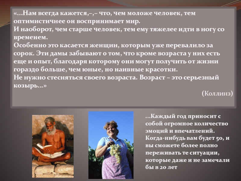 ...Каждый год приносит с собой огромное количество эмоций и впечатлений. Когда-нибудь вам будет 50, и вы сможете более полно переживать те ситуации, которые даже и не замечали бы в 20 лет
