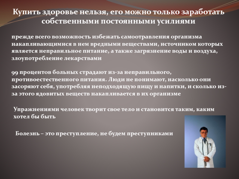 99 процентов больных страдают из-за неправильного, противоестественного питания. Люди не понимают, насколько они засоряют себя, употребляя неподходящую пищу и напитки, и сколько из-за этого ядовитых веществ накапливается в их организме