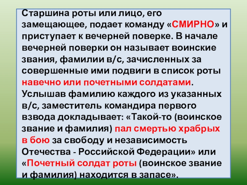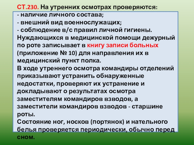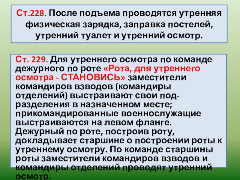 Ст. 229. Для утреннего осмотра по команде дежурного по роте «Рота, для утреннего осмотра - СТАНОВИСЬ» заместители командиров взводов (командиры отделений) выстраивают свои под-разделения в назначенном месте; прикомандированные военнослужащие выстраиваются на левом фланге.