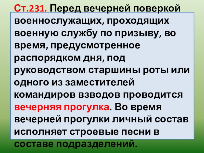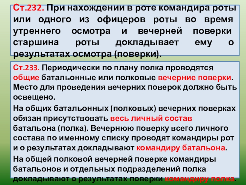 Ст.233. Периодически по плану полка проводятся общие батальонные или полковые вечерние поверки. Место для проведения вечерних поверок должно быть освещено.
