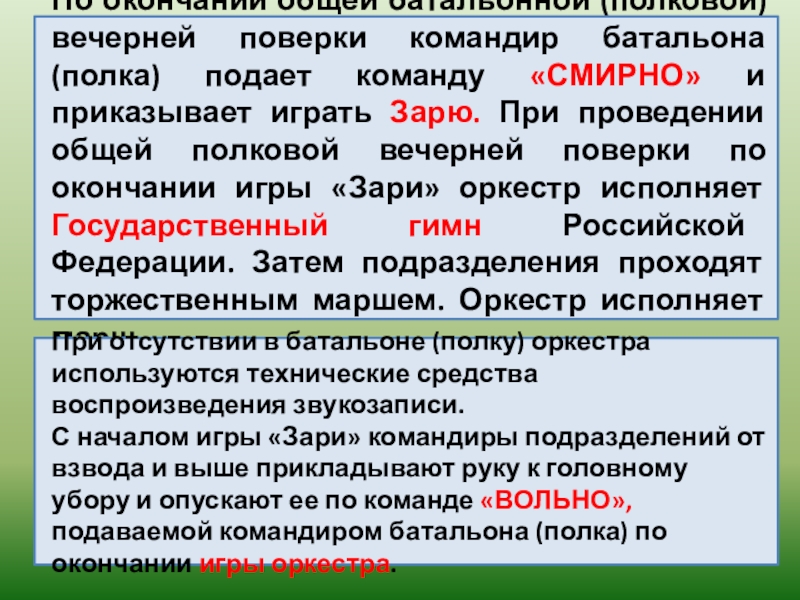С началом игры «Зари» командиры подразделений от взвода и выше прикладывают руку к головному убору и опускают ее по команде «ВОЛЬНО», подаваемой командиром батальона (полка) по окончании игры оркестра.
