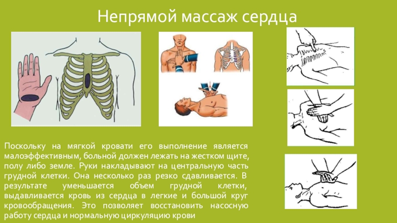 должен лежать на жестком щите, полу либо земле. Руки накладывают на центральную часть грудной клетки. Она несколько раз резко сдавливается. В результате уменьшается объем грудной клетки, выдавливается кровь из сердца в легкие и большой круг кровообращения. Это позволяет восстановить насосную работу сердца и нормальную циркуляцию крови.
