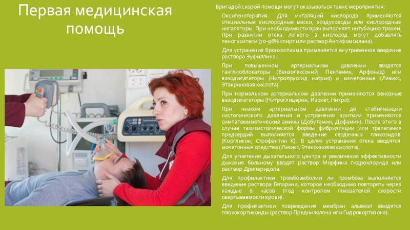 кислорода применяются специальные кислородные маски, воздуховоды или кислородные ингаляторы. При необходимости врач выполняет интубацию трахеи. При развитии отека легкого в кислород могут добавлять пеногасители (70-96% спирт или раствор Антифомсилана).