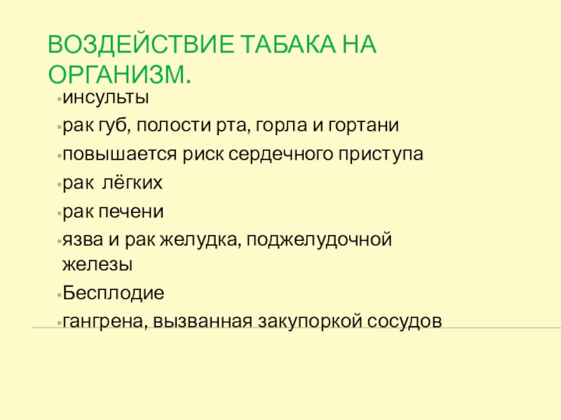 Слайд 16ВОЗДЕЙСТВИЕ ТАБАКА НА ОРГАНИЗМ.