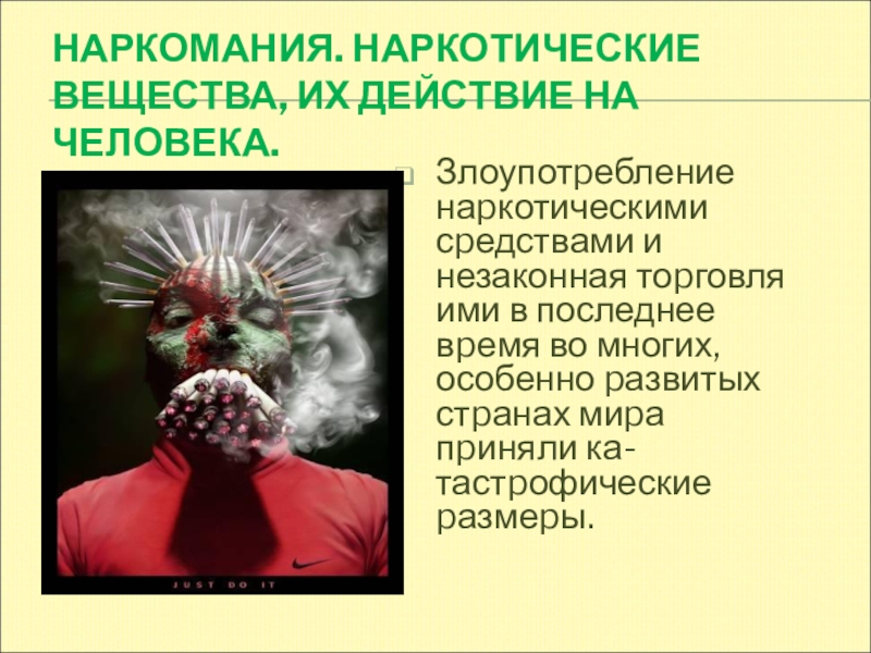 Слайд 23НАРКОМАНИЯ. НАРКОТИЧЕСКИЕ ВЕЩЕСТВА, ИХ ДЕЙСТВИЕ НА ЧЕЛОВЕКА.