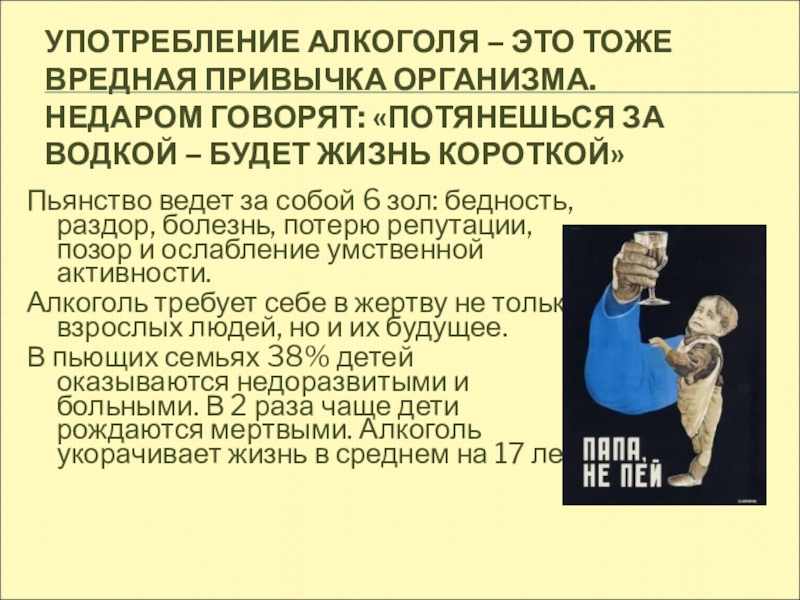 Слайд 19УПОТРЕБЛЕНИЕ АЛКОГОЛЯ – ЭТО ТОЖЕ ВРЕДНАЯ ПРИВЫЧКА ОРГАНИЗМА. НЕДАРОМ ГОВОРЯТ: «ПОТЯНЕШЬСЯ