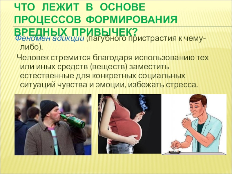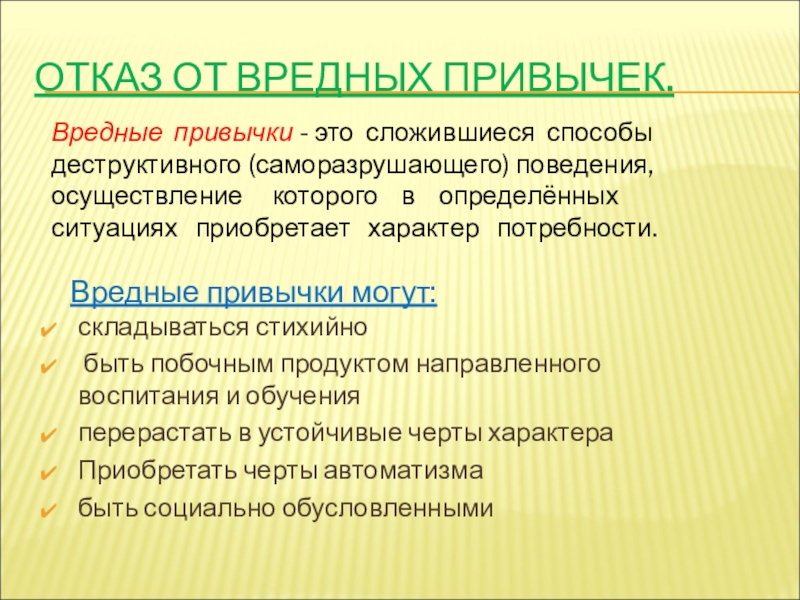 Вредные привычки - это сложившиеся способы деструктивного (саморазрушающего) поведения, осуществление которого в определённых ситуациях приобретает характер потребности.