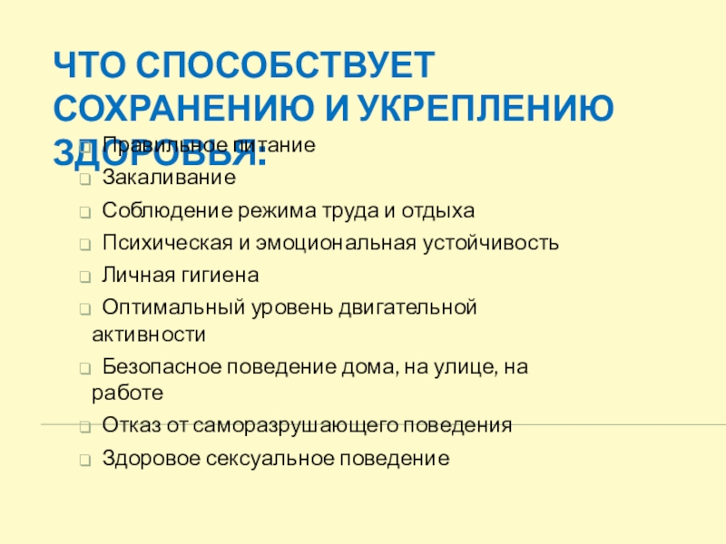 Слайд 3ЧТО СПОСОБСТВУЕТ СОХРАНЕНИЮ И УКРЕПЛЕНИЮ ЗДОРОВЬЯ: