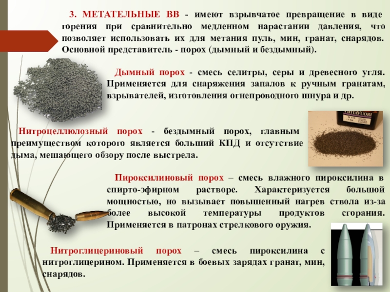 Нитроглицериновый порох – смесь пироксилина с нитроглицерином. Применяется в боевых зарядах гранат, мин, снарядов.