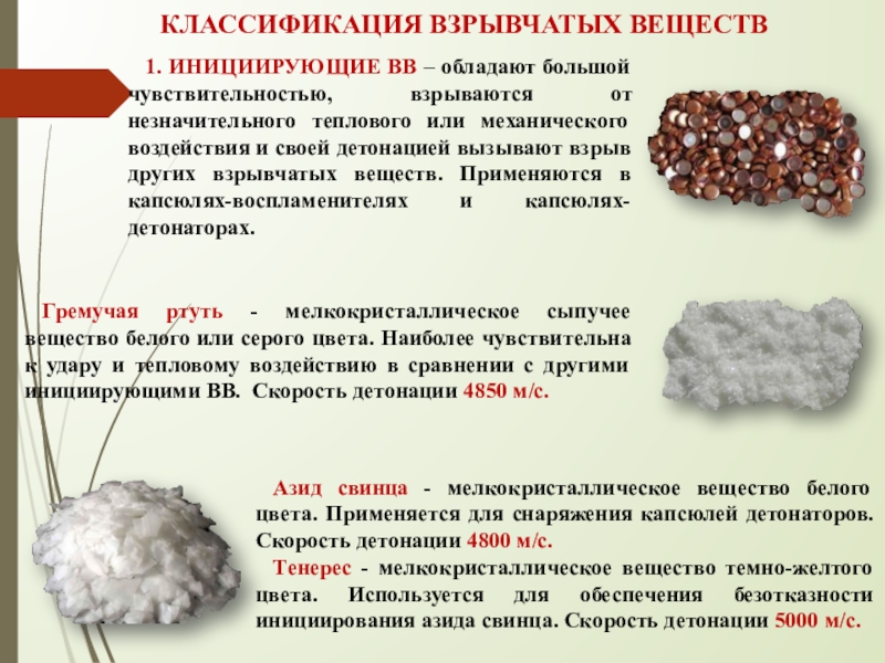 Азид свинца - мелкокристаллическое вещество белого цвета. Применяется для снаряжения капсюлей детонаторов. Скорость детонации 4800 м/с.