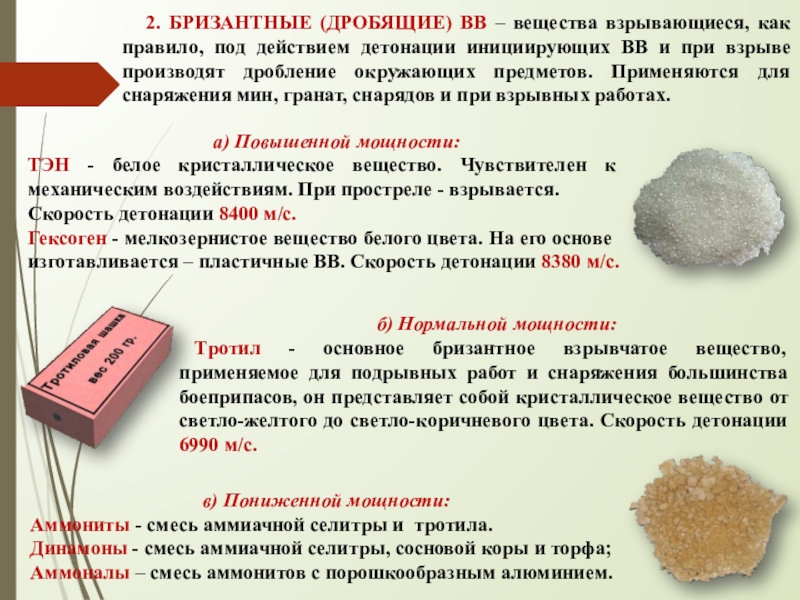 Бризантность – это возможность ВВ дробить предметы, находящиеся рядом с ним. Бризантные ВВ подходят для снаряжения мин, бомб, снарядов, т.к. дают осколкам наибольшую скорость и ударную волну.
