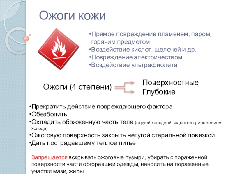 Запрещается вскрывать ожоговые пузыри, убирать с пораженной поверхности части обгоревшей одежды, наносить на пораженные участки мази, жиры