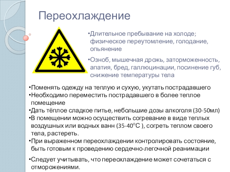 Следует учитывать, что переохлаждение может сочетаться с отморожениями.