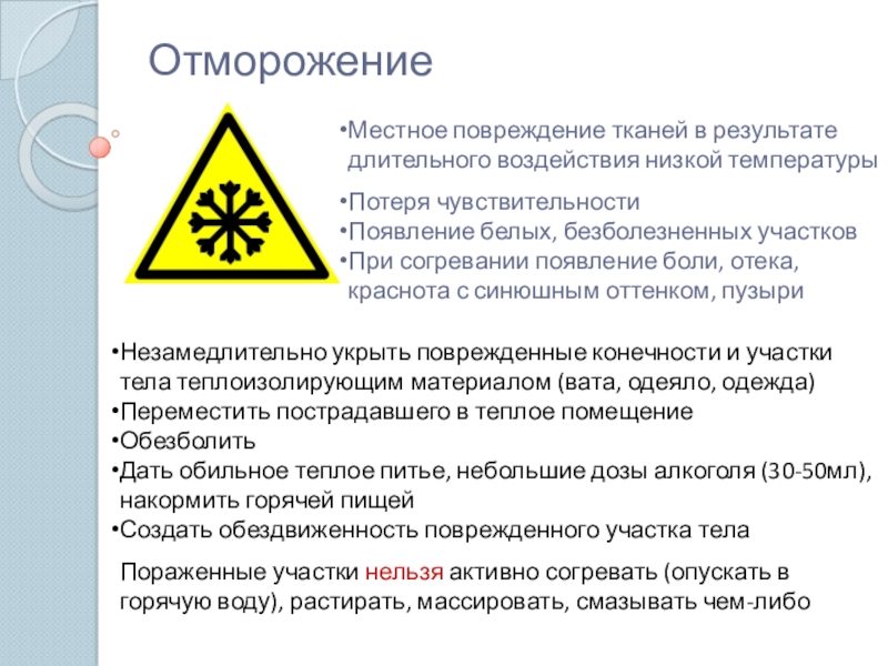 Пораженные участки нельзя активно согревать (опускать в горячую воду), растирать, массировать, смазывать чем-либо