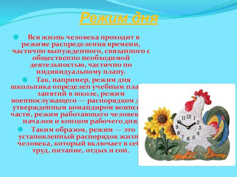 Так, например, режим дня школьника определен учебным планом занятий в школе, режим военнослужащего — распорядком дня, утвержденным командиром воинской части, режим работающего человека — началом и концом рабочего дня.