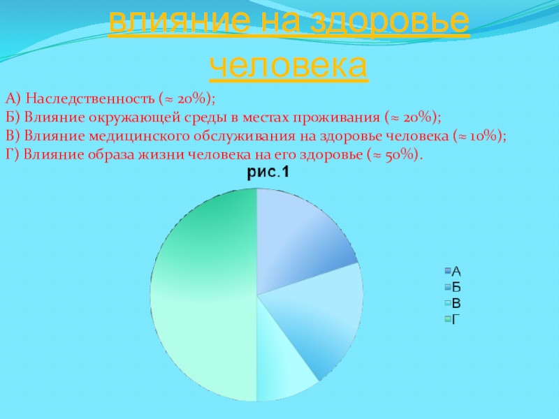 Г) Влияние образа жизни человека на его здоровье (≈ 50%).