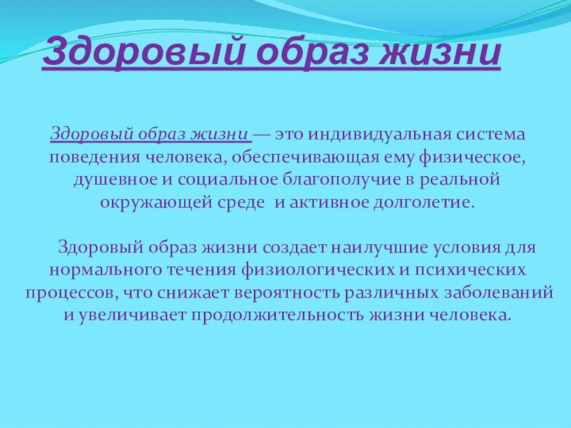 Здоровый образ жизни создает наилучшие условия для нормального течения физиологических и психических процессов, что снижает вероятность различных заболеваний и увеличивает продолжительность жизни человека.