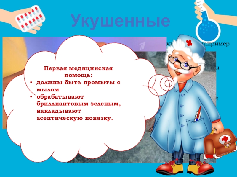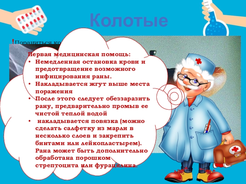 Края раны нужно смазать спиртовым раствором: йод, метиленовая синька, бриллиантовый зеленый и другие. Категорически запрещается «заливать» спиртовые растворы в полость раны. Смазывать нужно только края раны.