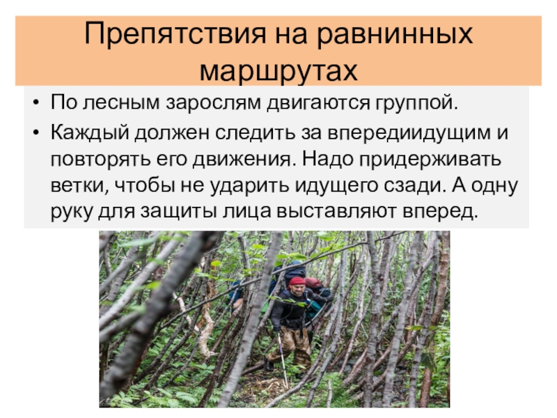 за впередиидущим и повторять его движения. Надо придерживать ветки, чтобы не ударить идущего сзади. А одну руку для защиты лица выставляют вперед.