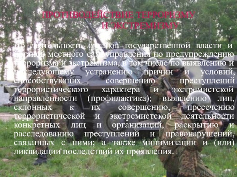 предупреждению терроризма и экстремизма, в том числе по выявлению и последующему устранению причин и условий, способствующих совершению преступлений террористического характера и экстремистской направленности (профилактика); выявлению лиц, склонных к их совершению, пресечению террористической и экстремистской деятельности конкретных лиц и организаций, раскрытию и расследованию преступлений и правонарушений, связанных с ними; а также минимизации и (или) ликвидации последствий их проявления.